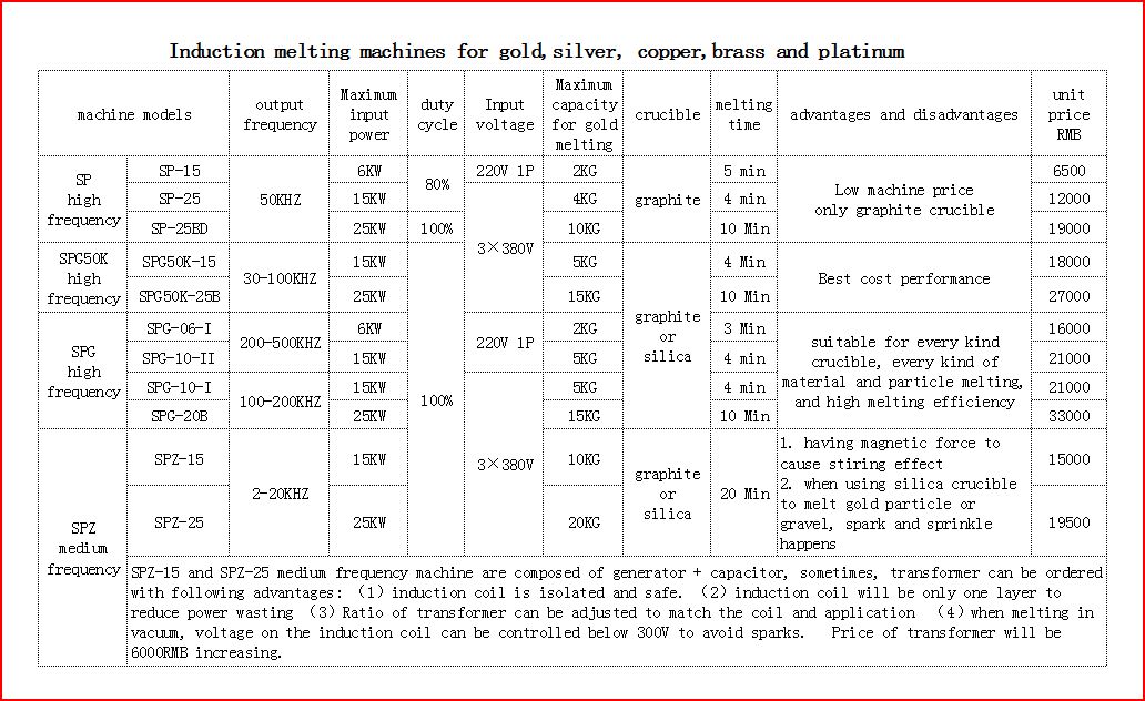 For 110KG gold and silver melting,  power of 625KW machine is suggestedFrequency of the machine will be chosen according to the details and desire of the melting application, such as crucible, melting material and particle size, melting quantity, melting time, magnetic force for stirring and vacuum melting or atmosphere melting, etc.  Machine models and main specifications are as following: