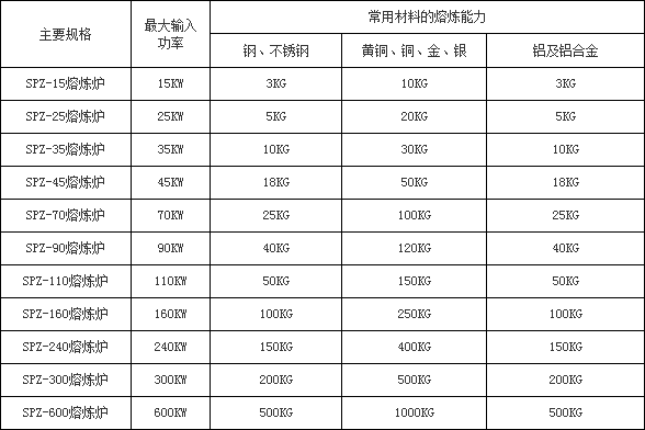 下表中所列為每種熔煉爐的最大加熱能力,冷爐時(shí),每爐熔煉時(shí)間為50--60分鐘,熱爐時(shí),每爐熔煉時(shí)間為20--30分鐘。