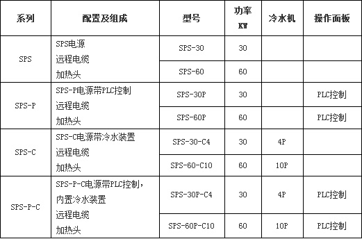 (4) SPS-P-C系列:在SPS系列的基礎(chǔ)上,增加了PLC控制和觸摸屏操作功能和內(nèi)置冷水機(jī);